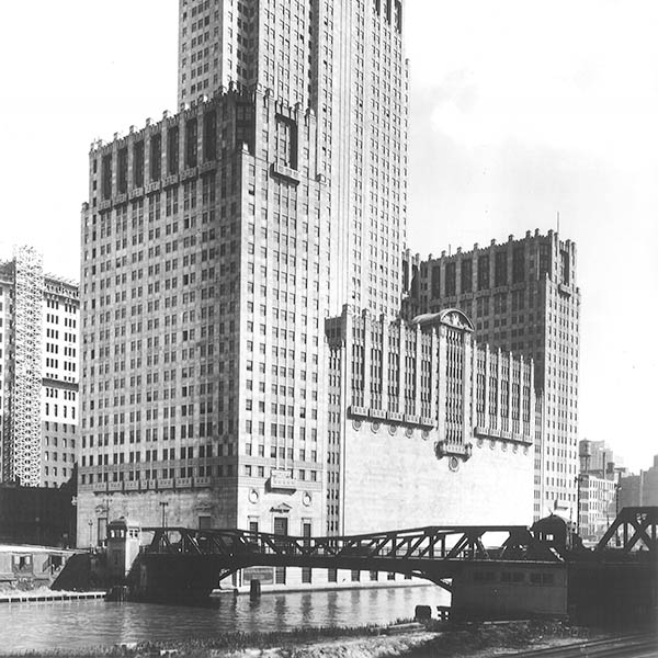 Театр размещен в 45-этажном небоскребе, который расположен на главной улице Уокер-Драйв. Здание возвели в 1929 году по проекту предложенного компанией «Graham, Anderson, Probst & White», которая известная в Чикаго строительством ряда объектов. Архитектурой занимался Альфред Шоу, ведущим инженером был Магнус Гандерсон. Здание оформили в стиле арт-деко, который в то время был самым распространенным.